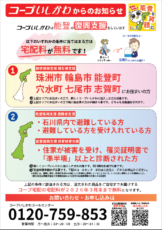 石川県内に食品・雑貨品などを配送します。コープ宅配(個人宅配)なら、1品からでも玄関先までお届けします。