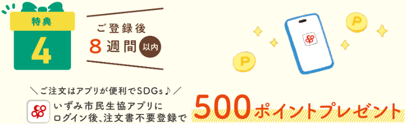 ご注文からお届け商品の確認まで完結できる「いずみ市民生協アプリ」に新規登録しログイン+注文書不要登録で今なら500ポイントプレゼント!
